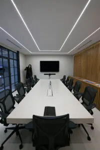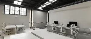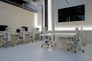 L’interior design è definito da materiali in cemento ed effetto cemento, toni neutri e superfici pulite che amplificano la luce naturale. Le grandi postazioni operative, organizzate su tavoli di quattro metri, incarnano il principio della collaborazione orizzontale.